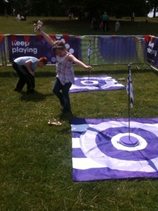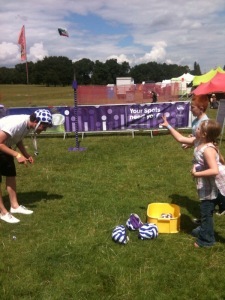 The Cadbury games crew were inviting members of the public attending the event to try out the Cadbury Spot v Stripes Minute To Win It games which are made up off child friendly mini games which were fantastic. The public were certainly up for the challenge as the Cadbury stand was heaving! Knowing little man could possible freak out having to wait in the long line on this very hot day his sister took to the line instead allowing him to join her once she had made it all the way to the front bless her. The games team were great and Ben the guy in charge was great with my little man keeping him entertained while he waited and putting up with his millions of questions about the Spots Vs. Stripes van (transport crazy)