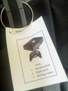 As for packing the correct things: Are the items he needs based on what day of the week it is? For example, does he always need his reading book on Mondays or is it random? Does he generally need the same basic items? I’ve seen good results from people making a laminated tag on the outside of a kid’s backpack with a picture of something they like, and a list of what to pack up. See the example above.