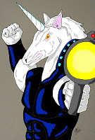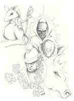 My second guest artist is Kevin, known as “ayelid” on Deviantart.com. Yes, his name is a link to his page. When you’re done reading here you really should check it out!Kevin did a pencil drawing of five GZ characters in one picture. I will tell you right now that this has spurred a short story idea with me! But back to the picture (click on it for larger view), from the top you have King Frederick the giant rat, Bloodraizer the assassin with his secret mentor hovering over him, Victor Darksong, and War Horse. King Fred and War Horse are the heroes of this picture by the way. Below you’ll see the original works of these characters. The most awesome thing he did, was to create a connection to autism, that’s the puzzle pieces.