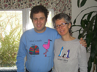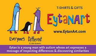 About a year ago, I decided it was time to start sharingEytan’s delightful artwork with others. An inspiration led me to pair his designs with messages about respectingdifferences, discovering similarities and about making a difference in theworld. I created a website and started abusiness called EytanArt™whose “tag line” is Designs About Difference. The 5 designs and messagesthat are currently on the site have been a big hit and there will be more tocome. The exciting thing is that thesedesigns and messages are shifting attitudes around the country and around theglobe each time someone wears an EytanArt t-shirt, hangs a poster in theirclassroom or office, mails a note card to someone they care about, etc.