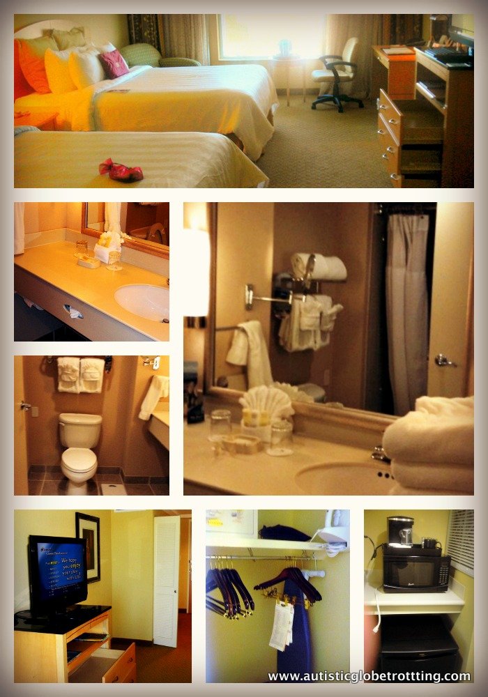 Plentiful pillows and comfortable bedding made for a pleasant night’s rest. In between the two queen sized beds, there was also a nightstand with an alarm clock and a phone.Facing the bed area was a large, flat screen television so that travelers could comfortably watch their favorite shows before going to sleep.Though the vistas were not advertised as a selling point at this location, we still had a good view of the nearby green spaces and some of the other hotels. Also visible from our windows was the outdoor kidney shaped swimming pool. Our accommodations also contained a seating area with a comfortable green armchair with a footrest and a small side table that was ideal for holding beverages or snacks while one was lounging about. Supplies for making coffee and tea were likewise found in the rooms. The work desk area in our suite came complete with a second chair, another phone, and an overhead lamp. The spot made an excellent place to sit and surf the web. After all, complimentary wireless internet, a much-appreciated amenity, is available in all parts of the hotel. There was also a large chest of drawers and sizeable closet to store our belongings in. The closet further contained an iron, a safe, and clothes hangers for our use. The microwave and mini fridge were likewise good touches that rounded out the room’s furnishings. The bathroom area was sufficient for our needs. It contained the usual features of a sink, a toilet, and a bathtub. A silver rack filled to the brim with towels of all sorts could be found just above the toilet, along with the basic amenity kit of soap, shampoo, conditioner and body lotion bottles and a scale.The tub/shower combination with good water pressure did not have a hand held shower head and was separated with a shower curtain. Overall, we found the standard room to be an adequate budget friendly fit for our family of four.