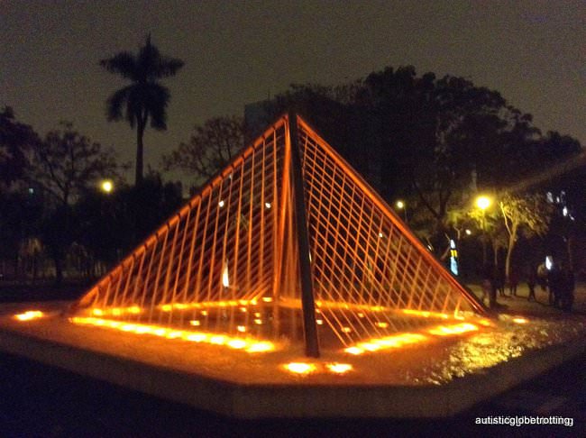 The Harmony Fountain (Fuente de la Armonía) is an orange pyramid shaped fountain whose water jet sides make it look like a continuous structure.Most colorful