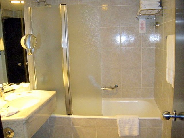 The Crowne Plaza Suites and rooms had nicely renovated bathrooms. The bathrooms of the rooms we stayed in were decorated in beige and tan hues.The bathrooms had a tub/shower combo with a handheld showerhead, grab bar, and shelf for towels. Furthermore, the tub/shower combos had a partial glass enclosure. We found plentiful toiletries and hair dryers on each of the sink counters.