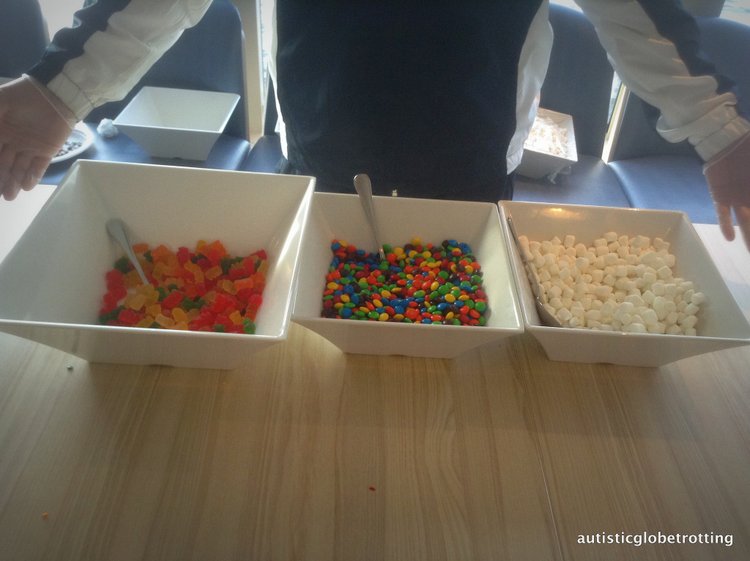 Activity participants were provided with a plain cupcake to use as a blank canvas for their tasty creations. Available cupcake topping options included icing, sprinkles, gummy bears, M&Ms, and marshmallows.And the best part; passengers got to take their creations back to the cabin, popular show mom and dad or enjoy as a late snack.