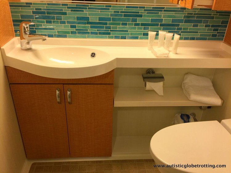 The shower features a high plexiglass enclosure and a handheld showerhead as well as a short retractable line to hang up wet bathing suits. We discovered that the area boasted good drainage, perfect as cruise-line cabins can easily flood. Toilet paper, tissues and towels are provided and you can ask housekeeping for more as needed.