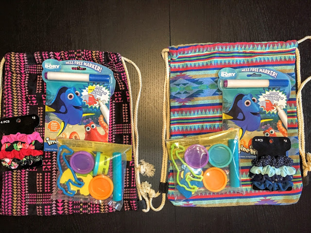 These are really simple to make and can really be catered to whatever your toddler is into. For mine I got some cute small drawstring backpacks and chose hair scrunchies, mess free marker activity books and playdough sets.