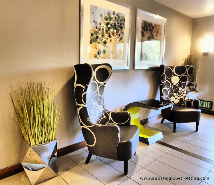 As visitors approach the hotel from the outside, they will see palm trees, clean lines and a modern look of the four-story sturdy, stately building. Inside, the lobby has a pretty sitting area all done in neutral tones with carpets and furnishings in creams, browns, and a few muted accents. The fireplace gives a homely and welcoming feel every month of the year. The guest rooms also have carpeting which is golden browns with flecks of turquoise.