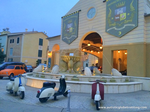 Inspired by the quaint towns of Portofino Italy, this luxurious hotel transported its guests to the Mediterranean beaches. The thought and attention to details included; like the narrow stone alleys beautifully arched windows and scattered Vespas and Fiat cars were impressive. The public spaces, set in marble and natural stone with beautifully painted frescos and Italian artifacts gave us the feeling that we were away on a relaxing European vacation.