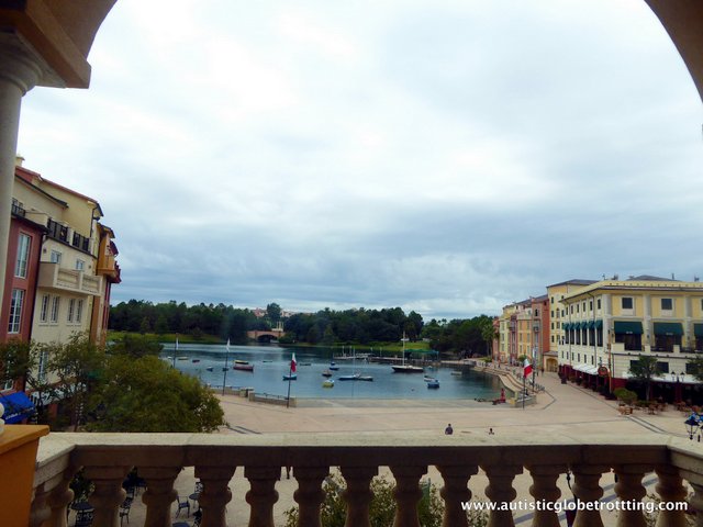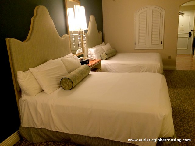 We stayed in room 2419, decorated in shades of cream and tan except for one of the walls, painted a bright aqua. The Italian theme was carried into the room with touches such as the small shuttered window and sculpted wood headboards.