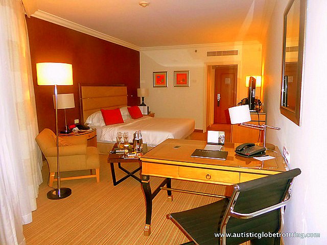 Our room on the 18th floor was luxurious and comfortable. The room featured subdued colors of creams, light browns, and reds with brown striped carpet flooring.The closet had great hanging space and deep drawers with a large safe that could fit a laptop. We especially liked the fact most things in the closet were at eye level.