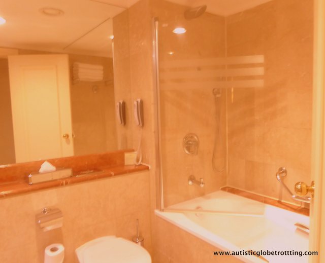 We had a king sized bed in the room. Along with the many lamps around the room, we had tiny nightlights attached to each side of the headboard, which we thought was a nice touch. Across from the bed, we saw a 40 inch sized TV and a surcharge mini bar with a selection of cold beverages. However, the cooler fridge under the TV that held the mini bar was computerized to register anyone lifting items out of it. Once a guest raised the drink out of its place, the cost would be charged to their bill.