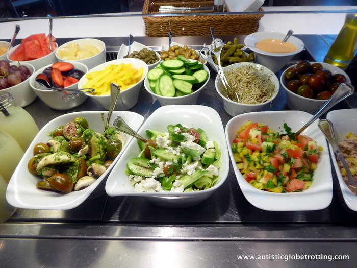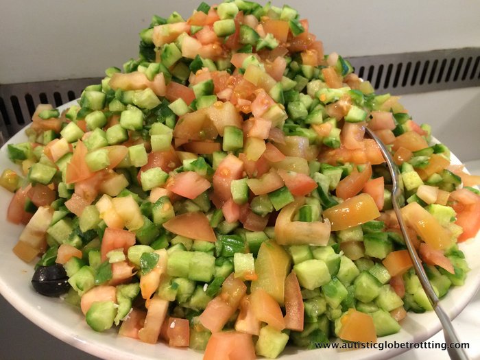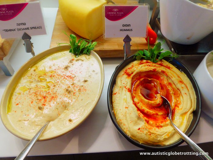 Travelers can enjoy garbanzo bean hummus paste with the ground sesame seed tahini, or the roasted red and yellow bell peppers in their marinade to the finely diced, or a simple Israeli salad of cucumber and tomato and a drizzle of vinegar and olive-oil dressing which is almost a national dish.