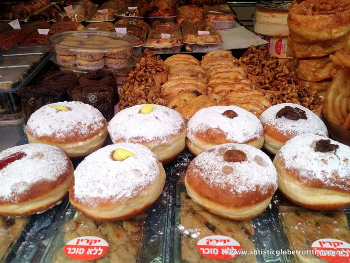 Unlike in the USA where there are donut shops, it is rare to find sweet deep-fried treats for sale. However, a few weeks before Hanukkah (which falls anywhere between November to December according to the calendar of Judaism) there are donuts in abundance. The sufganiyot come in ring form topped with chocolate, and different colored frostings; plain and decorated with sprinkles. But more commonly associated with this religious holiday are the jelly-filled ones with powdered sugar on top. In recent years the fillings have become more creative and exotic. Fillings range from dulce-de-leche, chocolate and vanilla cream to cappuccino!