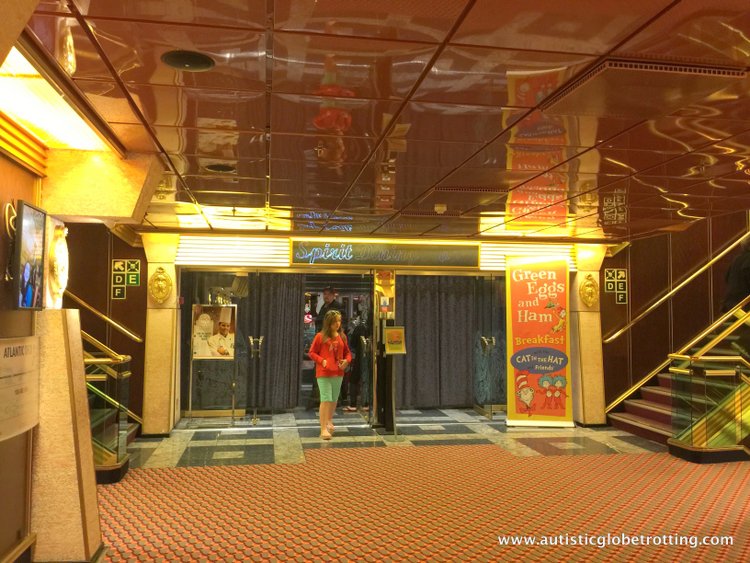 We enjoyed the character breakfast in the Spirit Dining Room at the back of the ship. Dining started at nine AM but families were lining up by eight thirty, and the venue was seating people half an hour early. The room for the breakfast was small, so parents should get a reservation ahead of time to guarantee a good table.