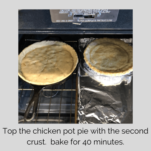 3. Put the pie crust in your pie dish or cast-iron skillet. Save the second pie crust for the top of the pot pie. If store bought, keep the second pie crust frozen until ready to flip out of the pie plate to top the pot pie. If you thaw, the pie crust sticks to the pie pan and breaks into pieces.