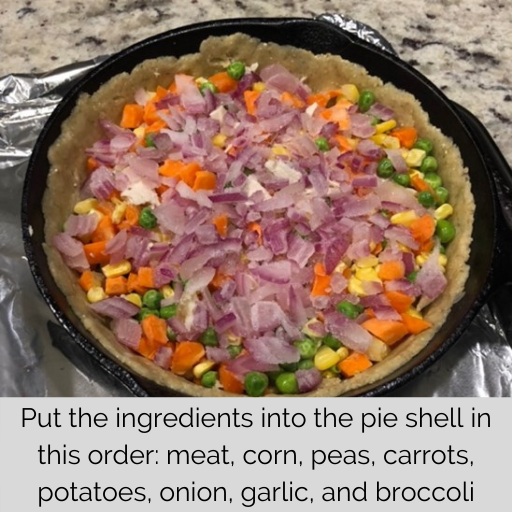 5. Put the ingredients into the pie shell in this order: meat, corn, peas, carrots, potatoes, onion, garlic, and broccoli.
