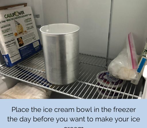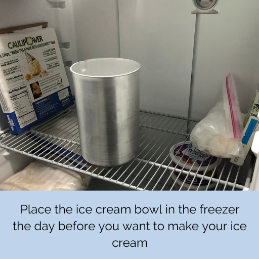 First, put your ice cream metal container in the freezer at least 2 or more hours before you make your ice cream or the day before.
