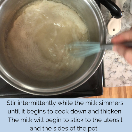 Allow it to continue simmering on the stovetop for one hour stirring every 5 to 10 minutes. As the milk cooks down and thickens, you will see the milk mixture look less foamy. It will also begin to stick to the stirring utensil and the sides of the pot.